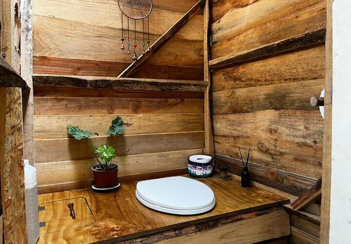 Ducha rústica al aire libre, rodeado de árboles y con las copas sobre ti, para una experiencia única en la naturaleza.